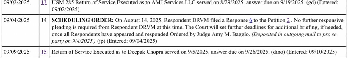 On the very same day, the prestigious firm Miller Nash appeared on behalf of “Deepak Chopra.” Their expected move is a Motion to Dismiss, claiming I named the wrong party. Even if they file that, it comes as other respondents have already blown their deadlines. Some entities — like AMJ Services and Maged Boutros — have simply failed to respond. Instead of answering as required, we now see DRVM and its lawyers trying to shield everyone from accountability through one procedural motion.