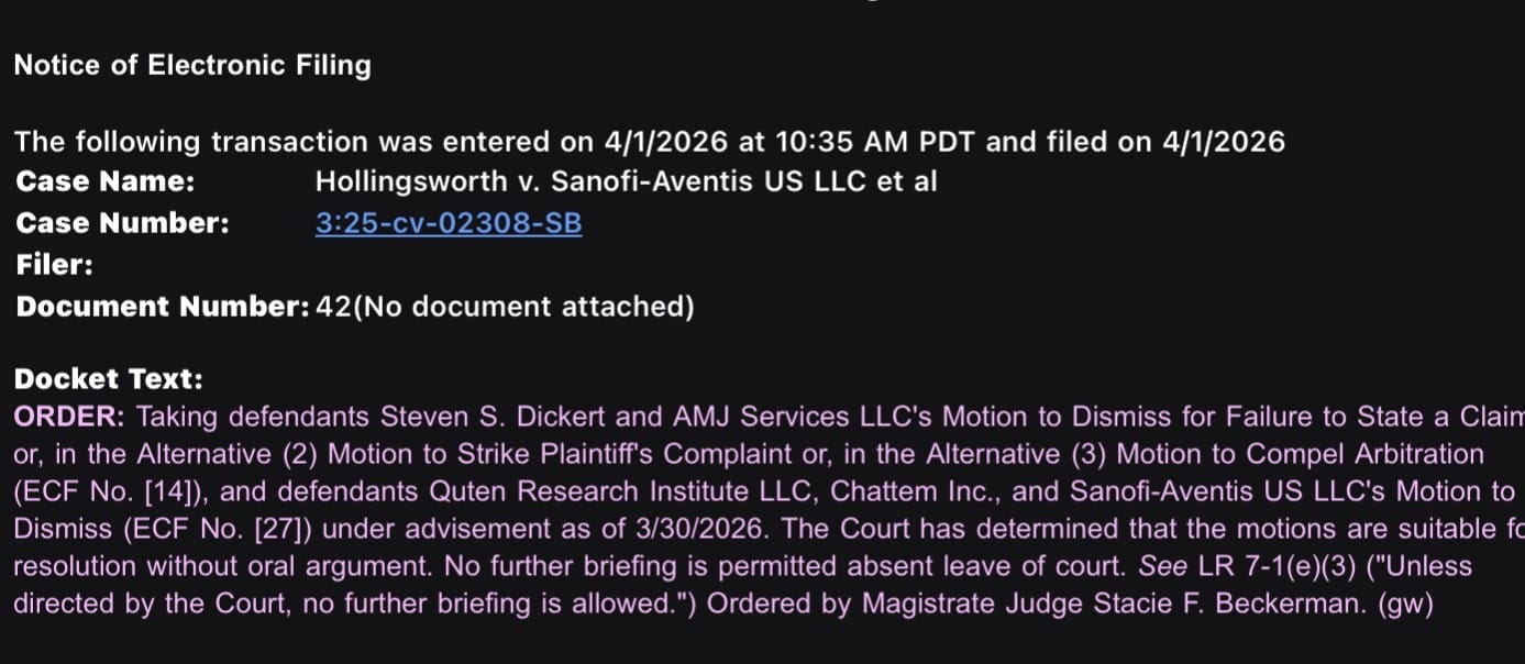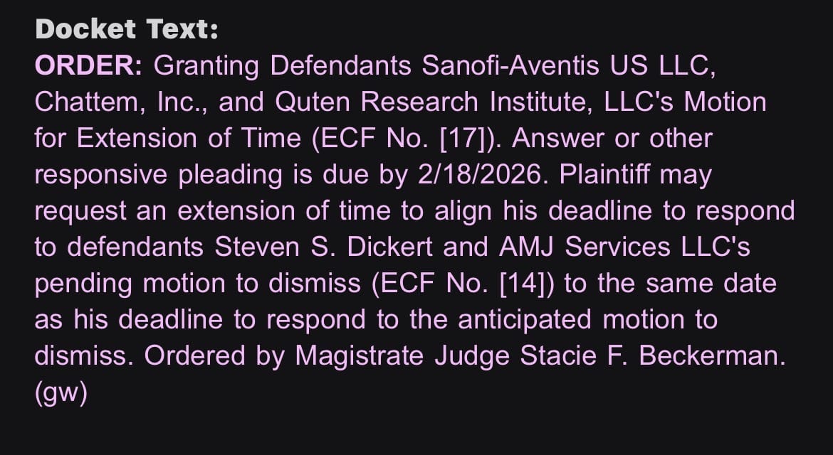 On December 11, 2025, I filed a new federal lawsuit in the United States District Court for the District of Oregon against Sanofi-Aventis U.S. LLC, Chattem Inc., Quten Research Institute LLC, AMJ Services LLC, and Steven S. Dickert, in his capacity as Trustee of Basil Management Trust.
