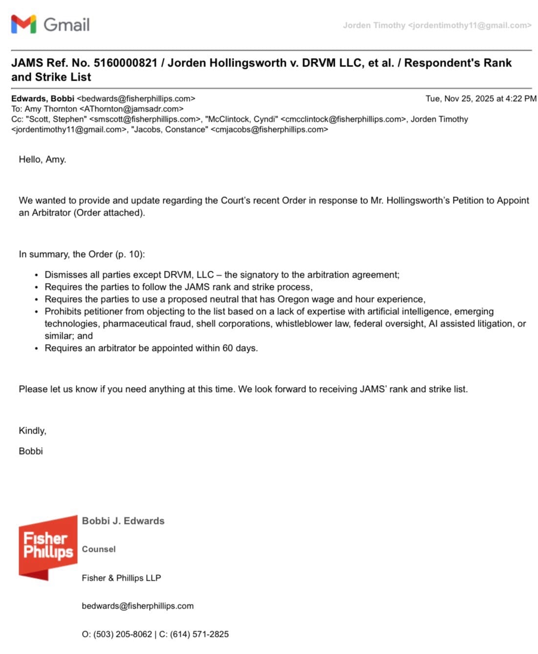 the moment the judge issued her ruling, Fisher Phillips immediately emailed JAMS to announce “we won” and that “everyone else is dismissed.”