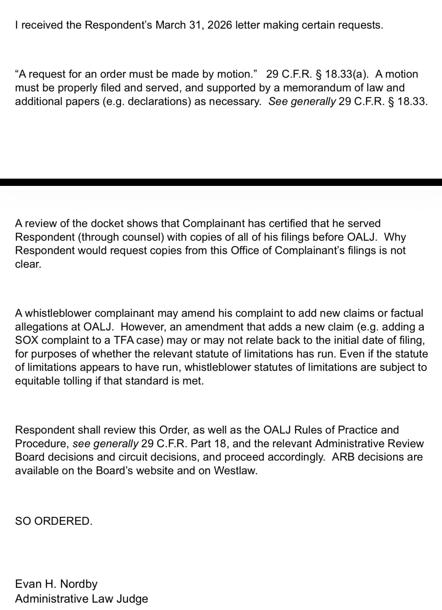 On April 8, 2026, the Administrative Law Judge issued an order addressing Respondent’s March 31, 2026 letter, making clear that requests for relief must be made through a properly filed motion—not through informal correspondence. The Order reinforces that Respondent must follow the formal rules of procedure under 29 C.F.R. Part 18, including filing motions with legal support and proper service. The Court also noted that Complainant has been properly serving filings, and questioned why Respondent sought copies from the Court instead of reviewing materials already served. Additionally, the Order confirms that amendments to whistleblower complaints—including adding SOX claims—are permitted at this stage, subject to standard legal principles like relation-back and equitable tolling. In practical terms, this means Respondent cannot bypass the rules through informal letters and must proceed through proper motion practice while the case continues to move forward under the applicable whistleblower framework.